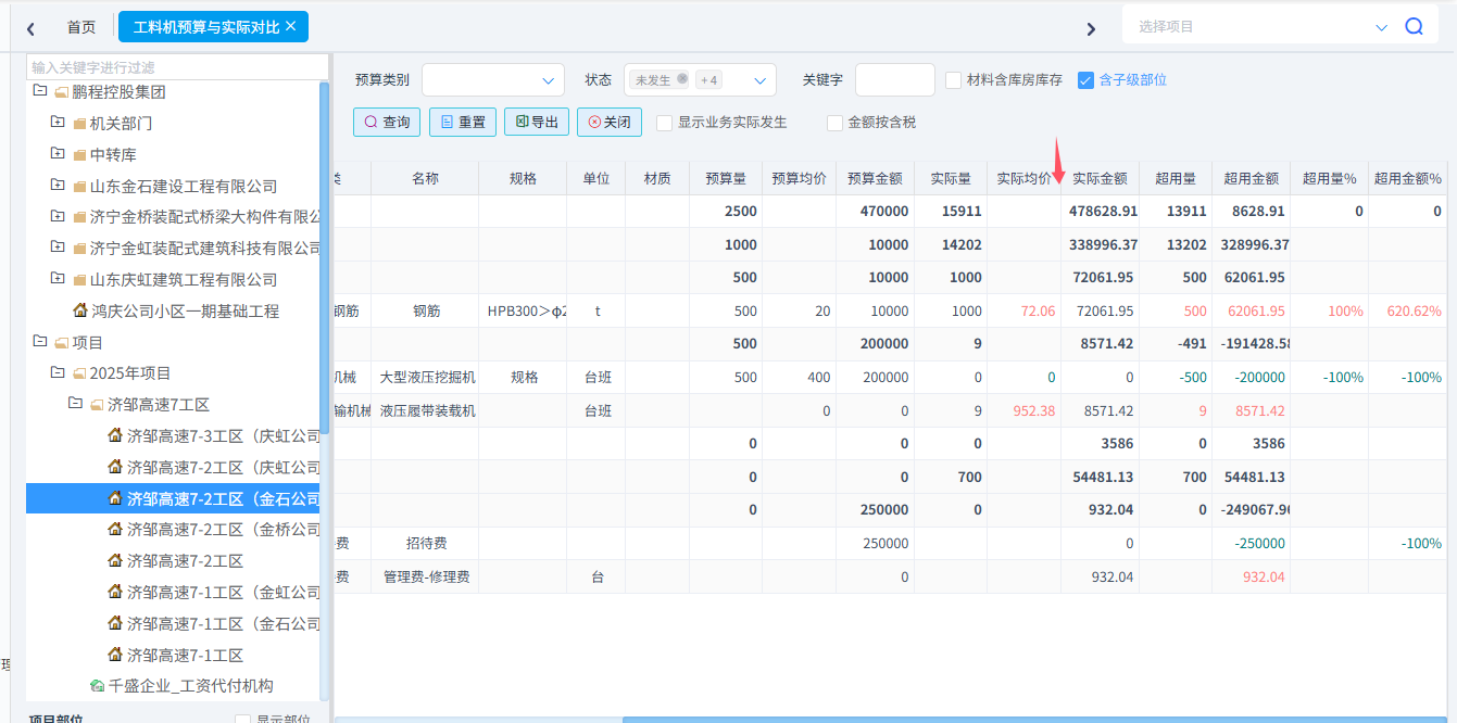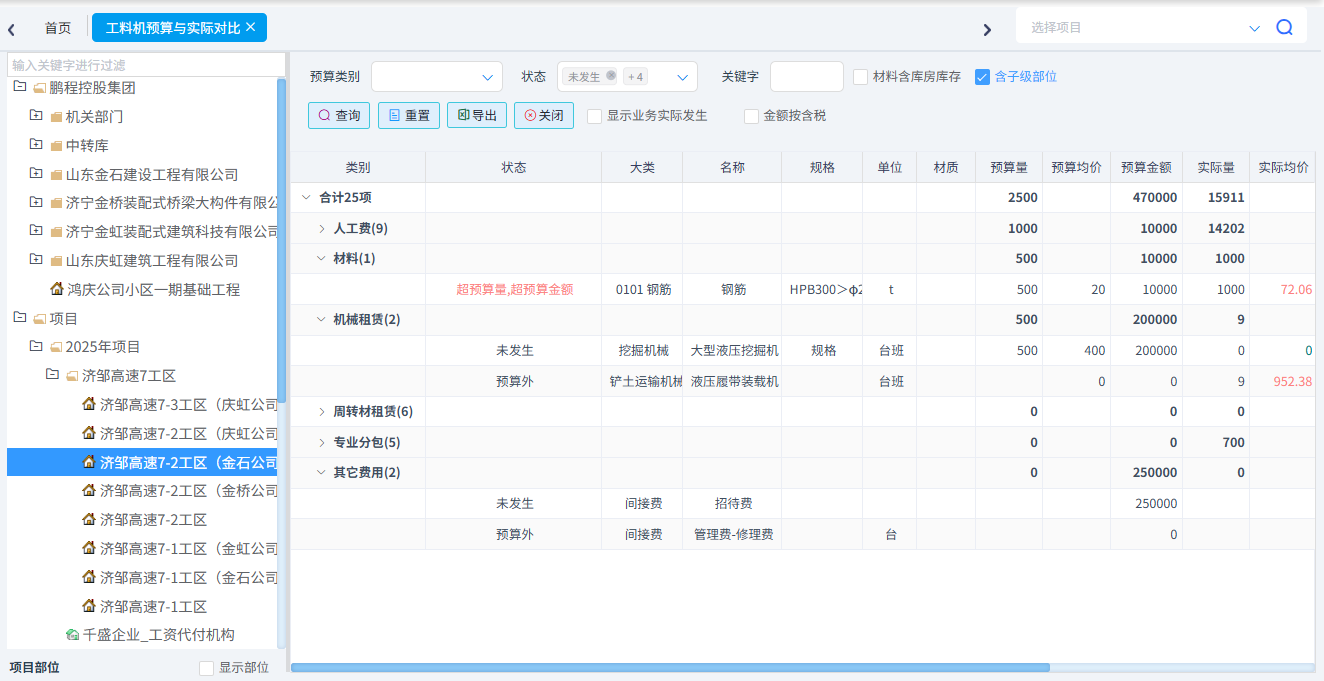可以统计工料机预算与实际对比、合同清单与实际发生对比、分部分项四算对比
