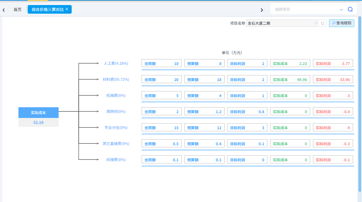 根据设置的合同人工费、合同材料费、合同机械费、合同周转材、合同专业分包、合同其他直接费、合同间接费、合同金额、预算人工费、预算材料费、预算机械费、预算周转材、预算专业分包、预算其他直接费、预算间接费、预算金额16项预算金额与实际发生金额进行对比,实际发生金额计算规则可以根据查询规则进行设置。