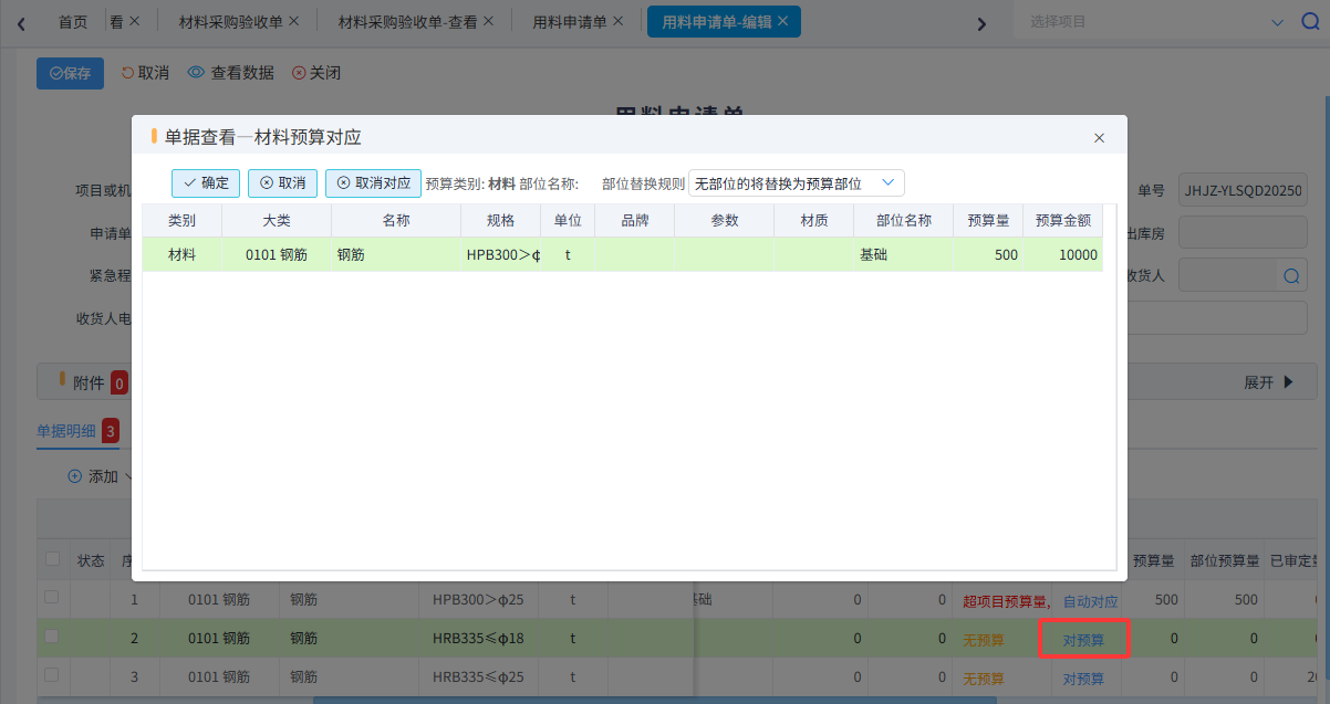 如果单据填写时或者以后查询预算对比时发现预算材料跟实际发生不一致,可以选择手动对应预算