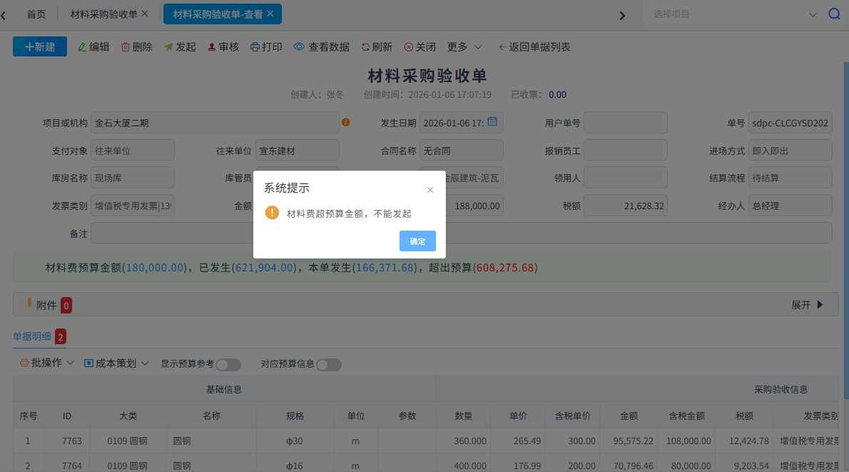 成本单据保存超出项目策划金额时系统可以根据参数设置进行预警控制