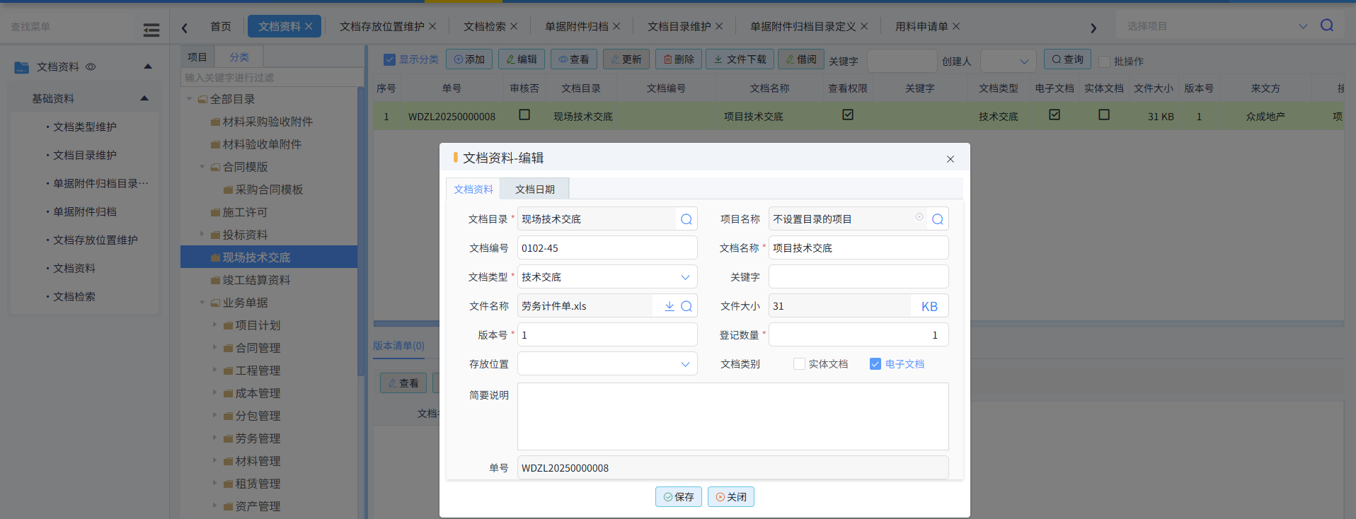 左侧选择目录,点击添加,输入文档名称,选择文档类型,若是电子档,勾选电子文档,文件名称处选择文件上传,输入版本号等,如果是实体文档,无需上传文件,但需选择存放位置,如下图所示