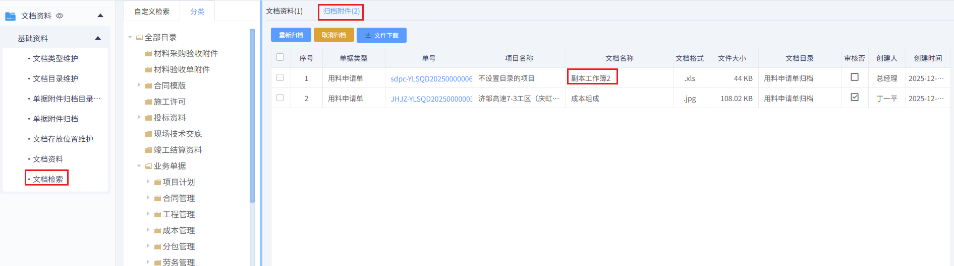 文档检索,用于查询、查看和下载文档资料上传和单据附件归档后的资料文件,