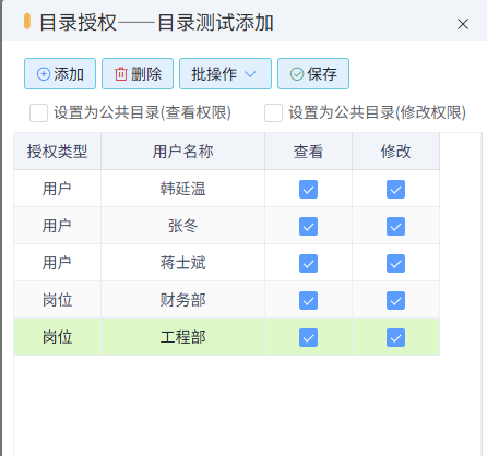 授权:用于授权当前目录的权限,权限分为查看和修改,可以设置为公共目录(查看权限),也可设置为公共目录(修改权限)。如下图所示,