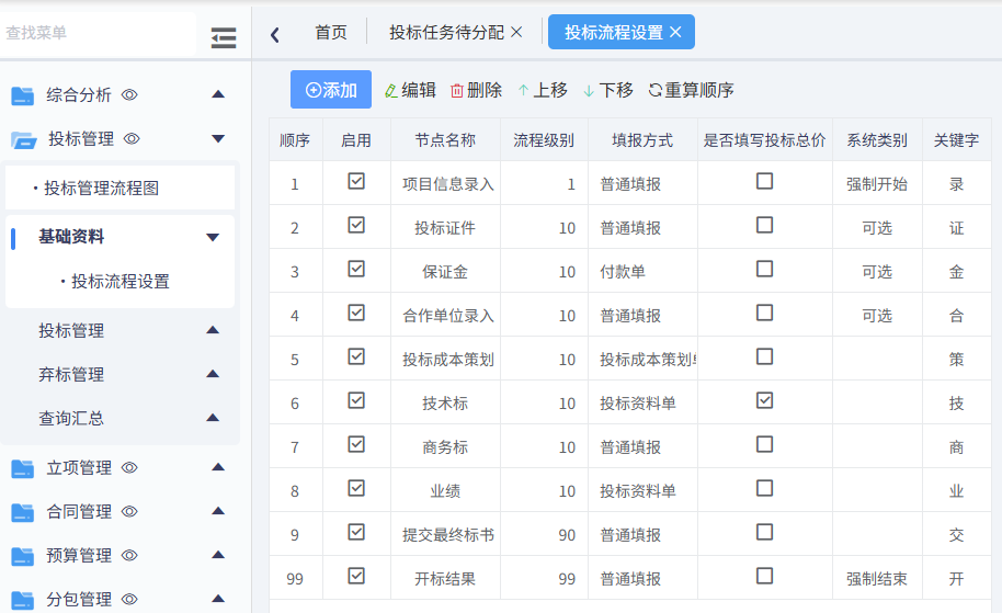在此界面中的投标任务节点,是在投标流程设置中预先设置好的,若与公司现有流程有差异,可自行设置投标流程