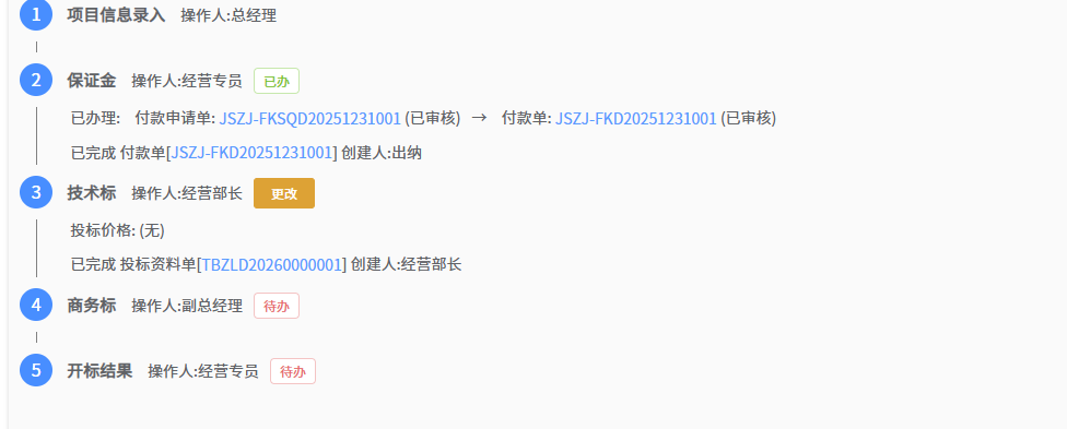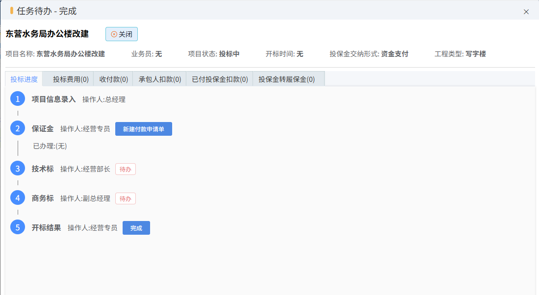 付款申请审核通过后,由财务出纳做付款单,完成投保金付款的闭环。在投标任务已办中,可看到状态的变化。如下图所示