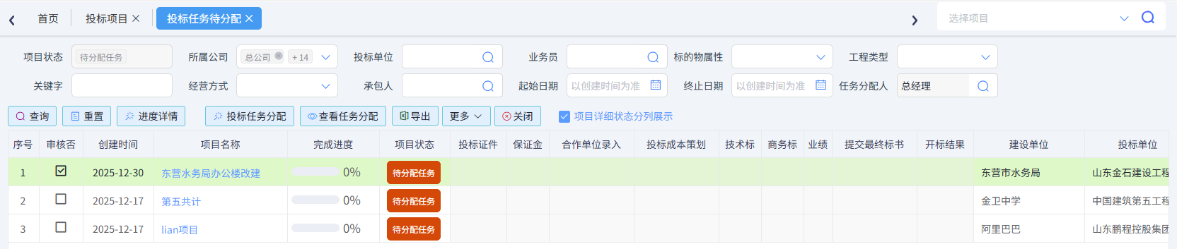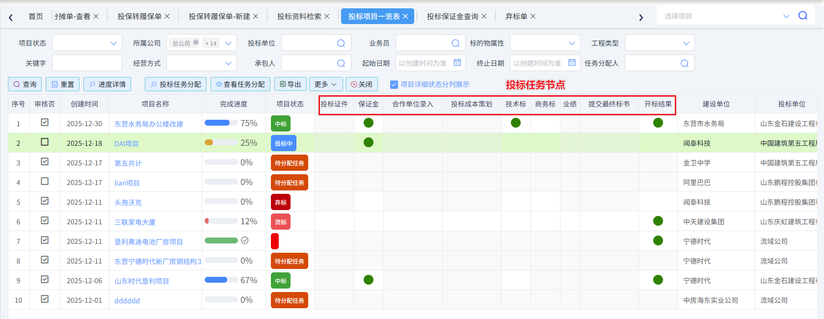 投标项目一览表可以查看投标项目状态、完成度、投标任务节点、中标单位、中标金额等信息,如下图所示