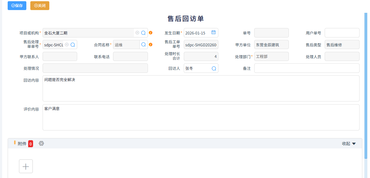 本模块是专门针对施工企业工程结束后进行售后维保或者施工企业接售后运维项目所设立的模块。可以管理巡检、售后工单、技术人员派单、现场添加维修记录、客户售后回访等功能,并能关联工程结算或者其它收入结算,进行收款。