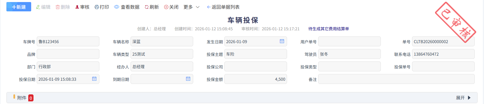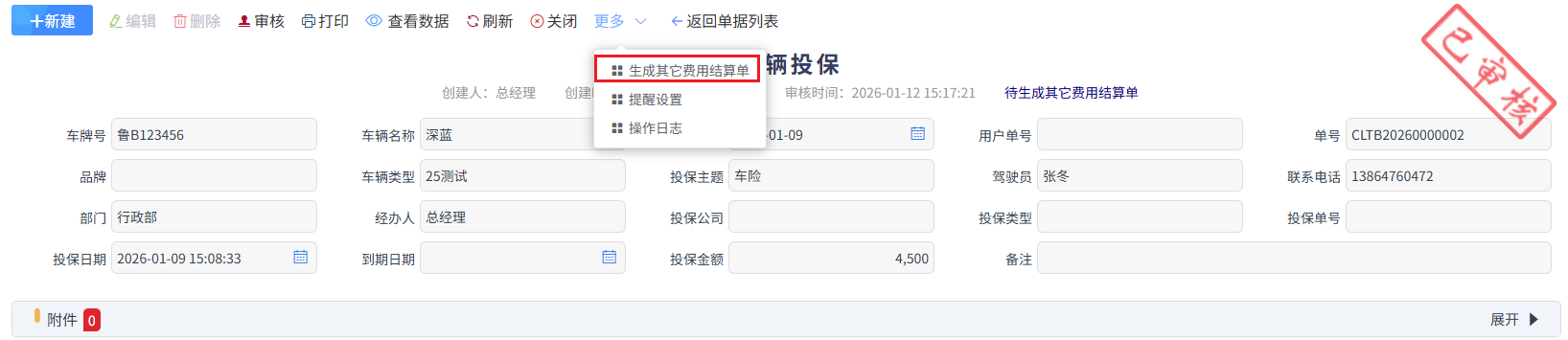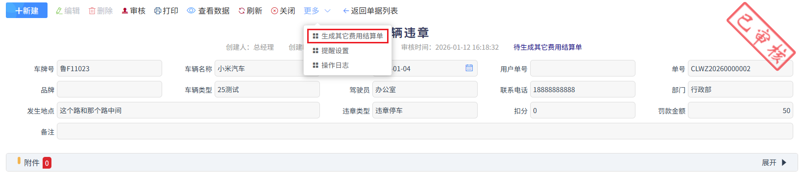 罚款金额为违章罚款金额,审核完成后,更多中生成其它费用结算单,走报销流程。如下图所示