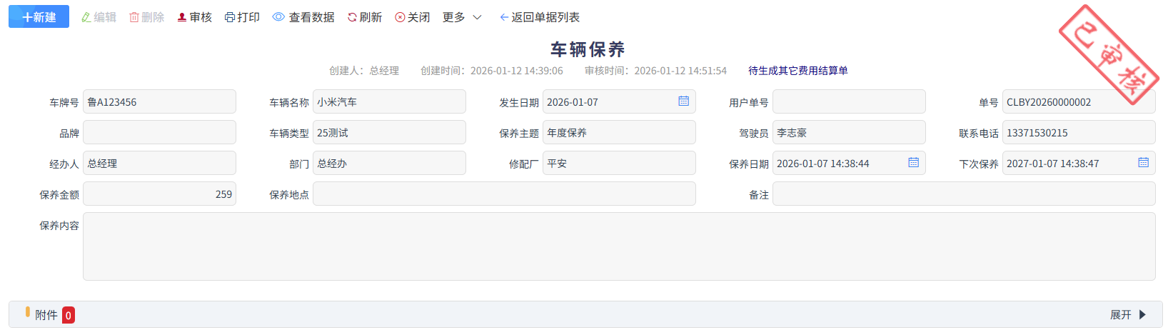 车辆保养的相关费用,输入保养金额中,审核完成后,点击更多中的生成其它费用结算单进入进入报销流程,如下图所示