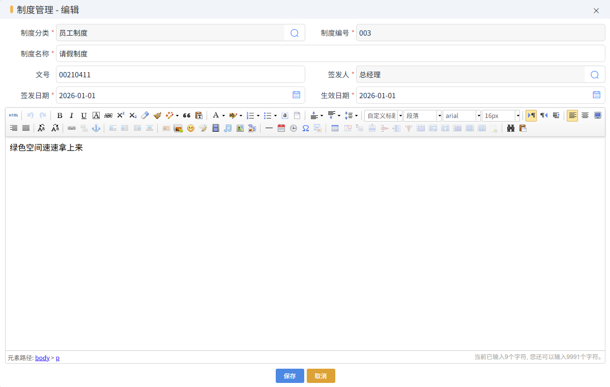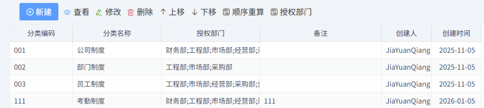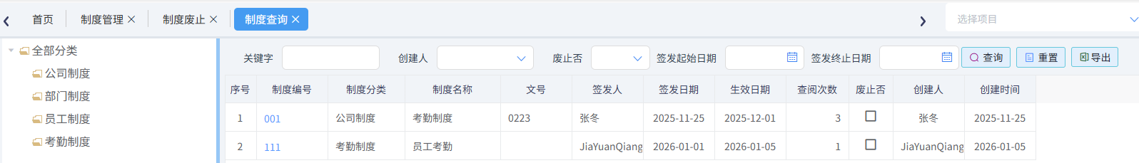 可以根据关键字,创建人、废止与否等查询相关制度,如下图所示