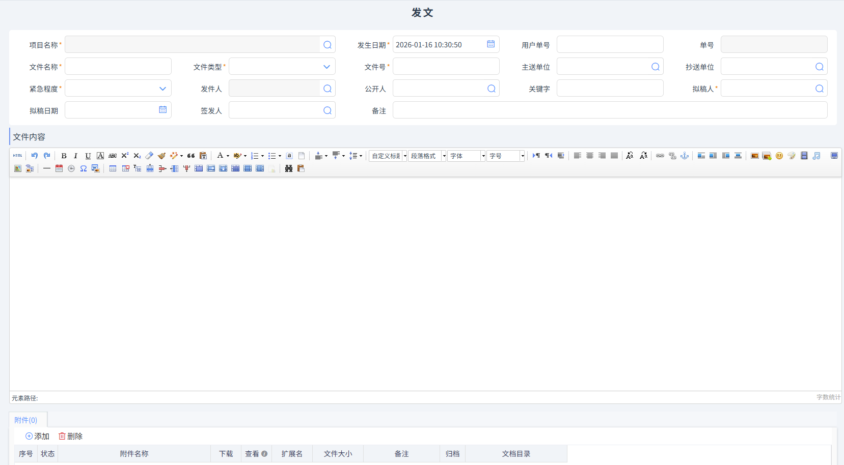 和收文类似,根据发文要求填写文件名称、文件类型、主送单位、拟稿人等,并附上发文电子档,如下图所示