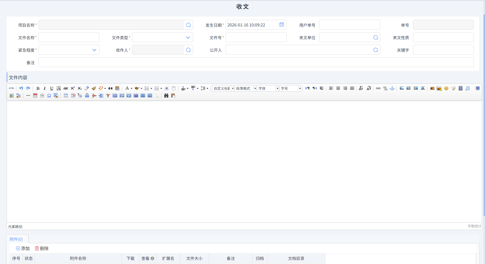 来文后,根据来文信息,填入收文中,项目名称、文件名称、文件类型、来文单位、来文性质、收件人、公开人等,特别注意的是下方要附上来文的原始文件电子档,如下图所示