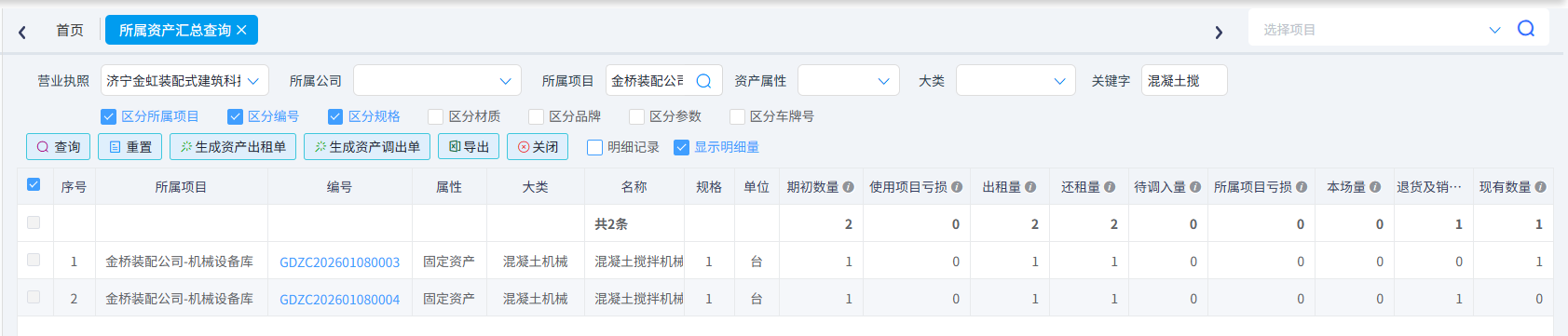 资产归属权项目的库存量及租还情况进行精准查询