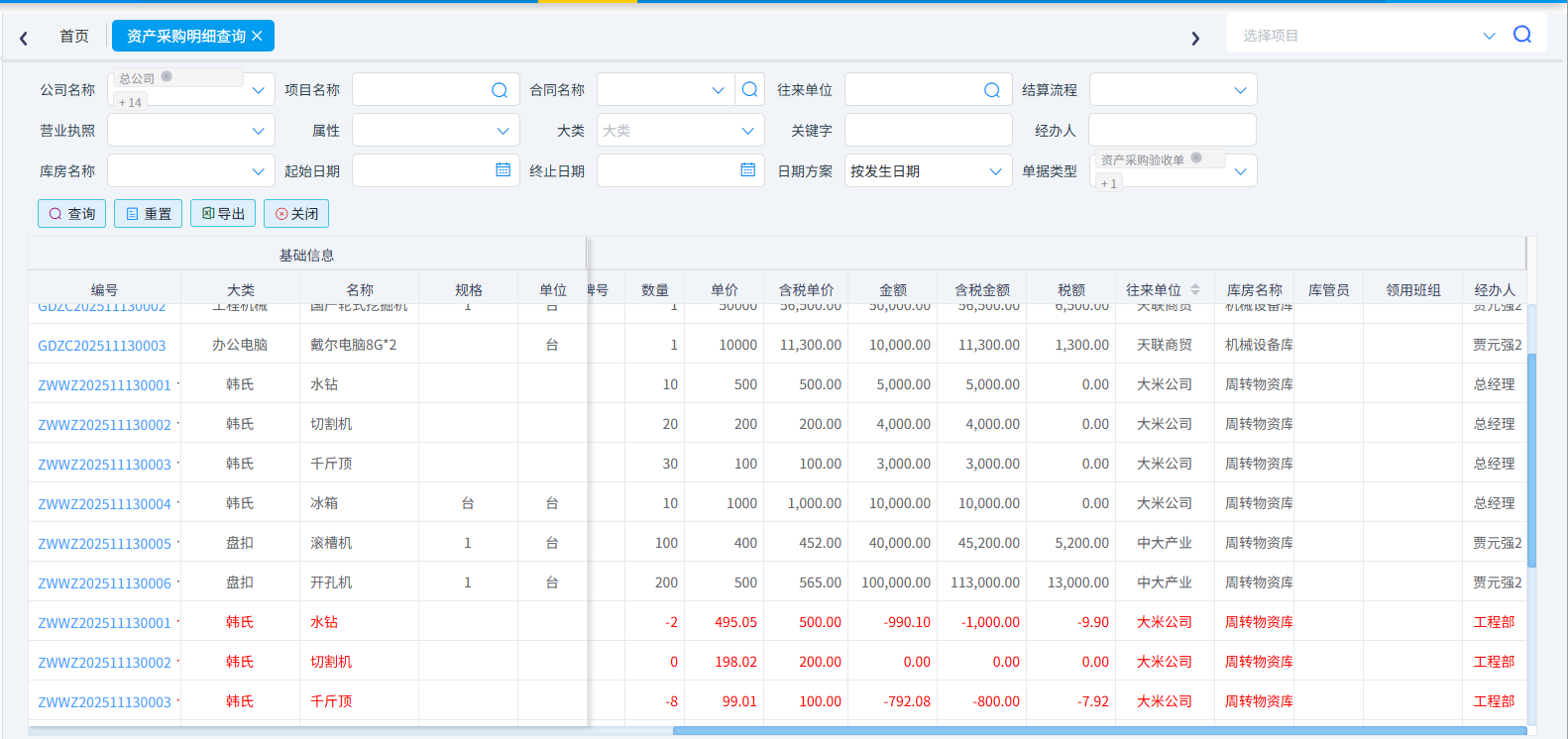 (4)资产采购明细查询(红色字体为资产退货)