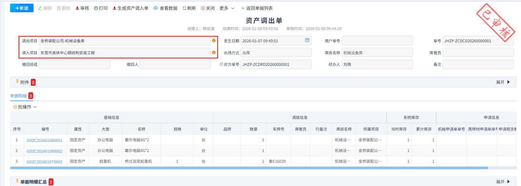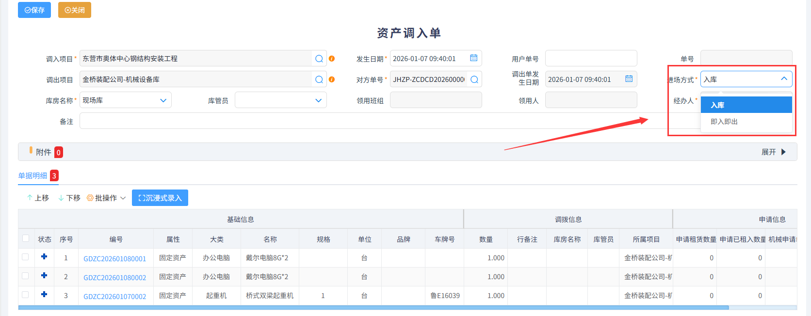资产调入是指企业将资产从其他项目、部门或仓库转入特定使用地点的流程,资产调入单须通过已审核的资产调出单生成,生成过程中调入方可根据实际情况选择入库和即入即出(此选项不进入库房,领用无需出库)