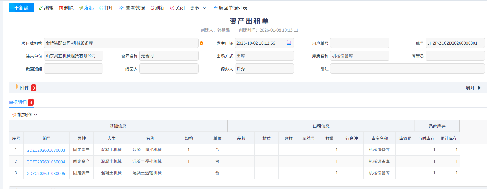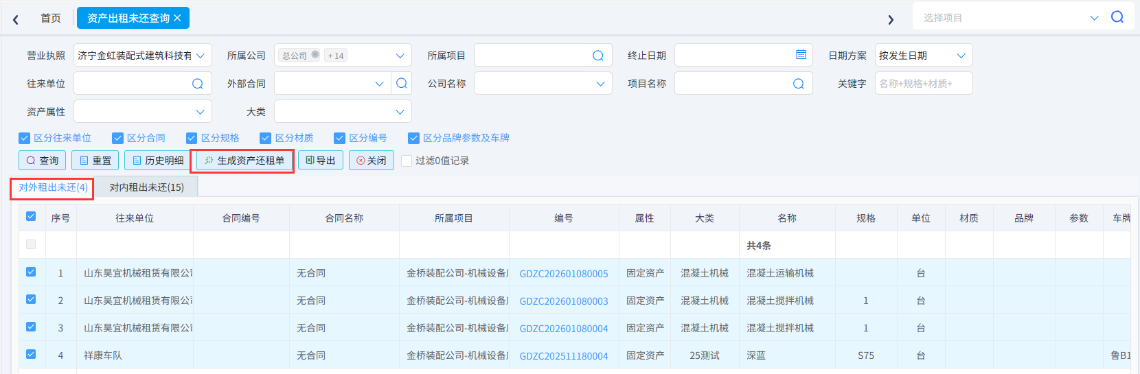 系统对内出租与对外出租分开展示一目了然且支持在查询内快捷生成资产还租单