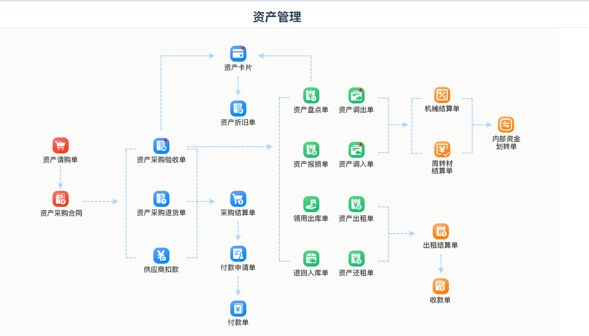 资产管理是公司的固定资产的管理,包括资产的采购、日常维修和保养、报损、折旧、项目调拨、在各项目的分布,针对公司内部的使用成本核算,也可以用于对外出租产生收入(相关单据:【资产出租单】,【资产还租单】,【资产出租结算单】