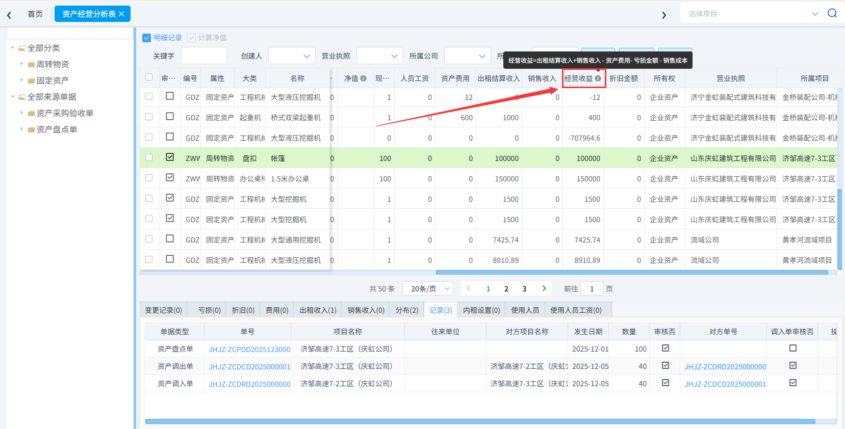 经营收益=出租结算收入+销售收入 - 资产费用- 亏损金额 - 销售成本