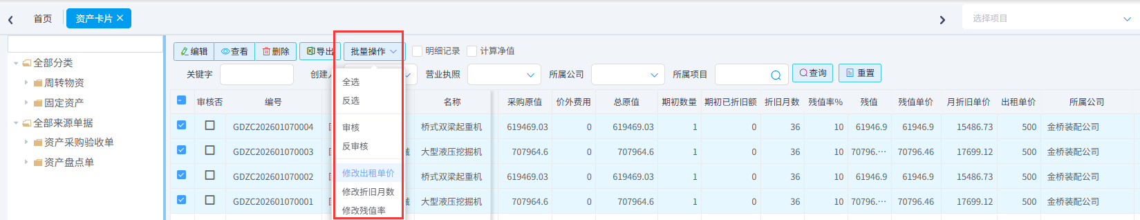 资产采购验收单审核完成后系统会自动生成资产卡片。