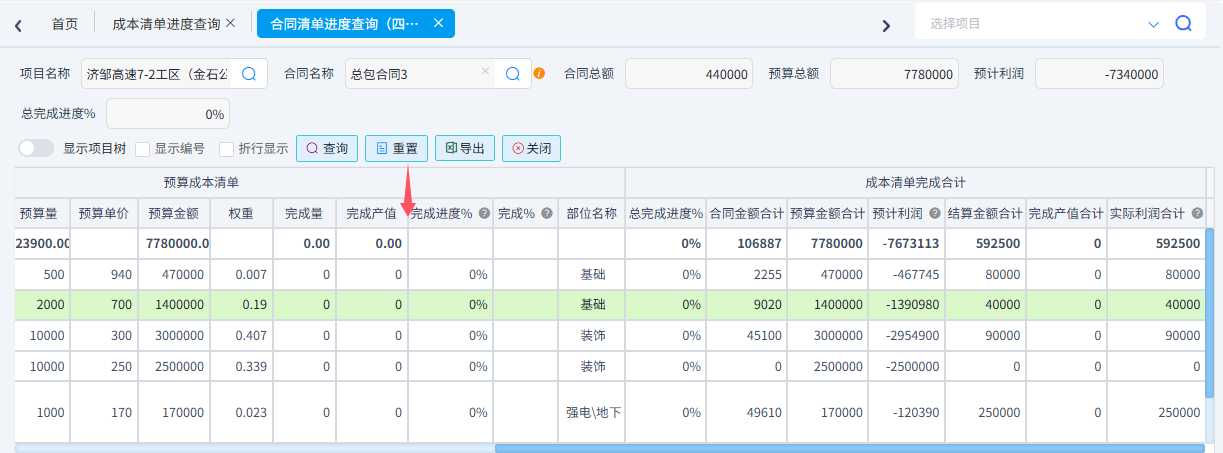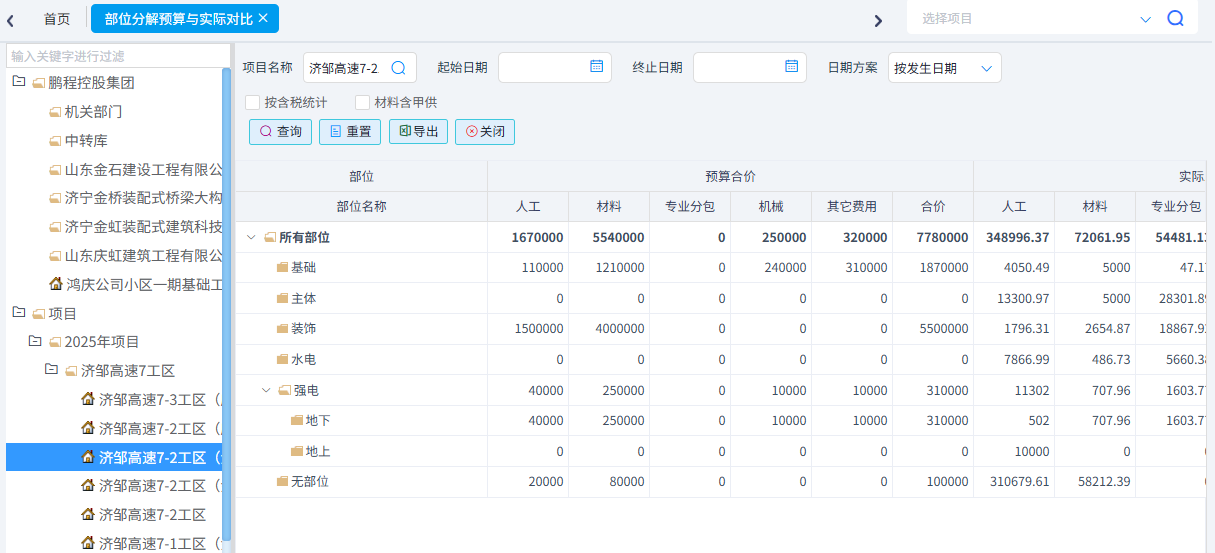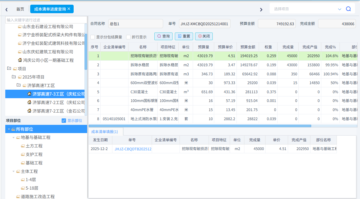 可以根据需求统计成本清单进度、合同清单进度(四算对比)、项目部位实际发生以及部位分解预算与实际发生。