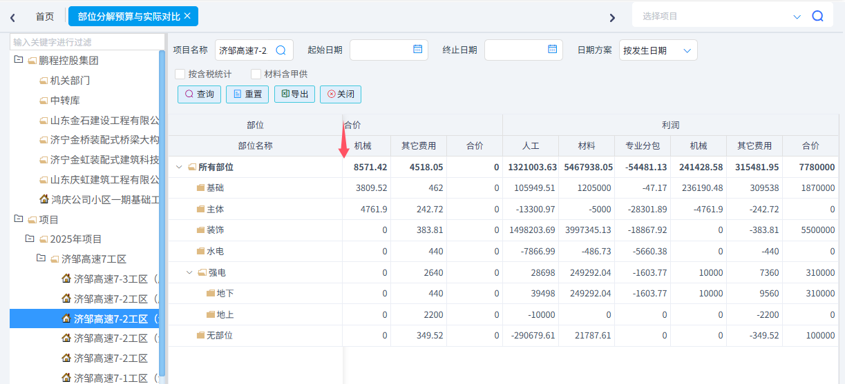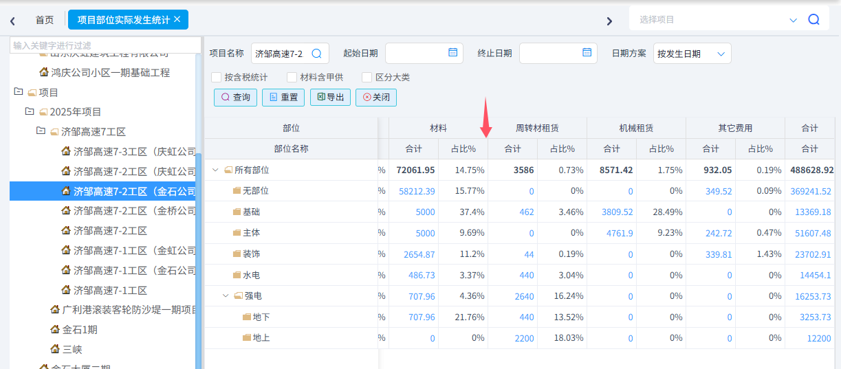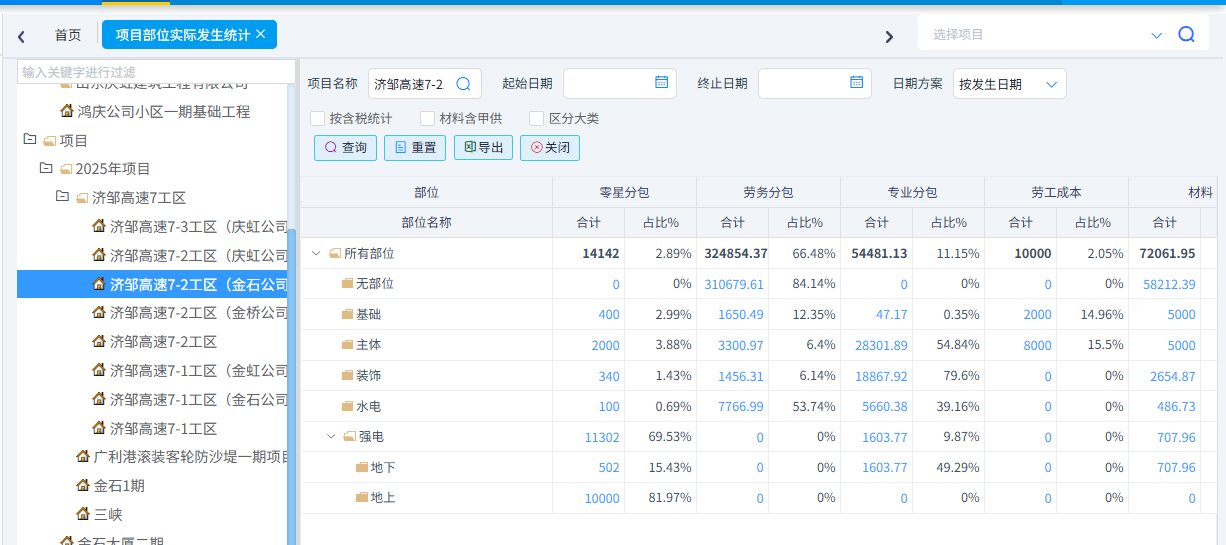 项目部位实际发生统计