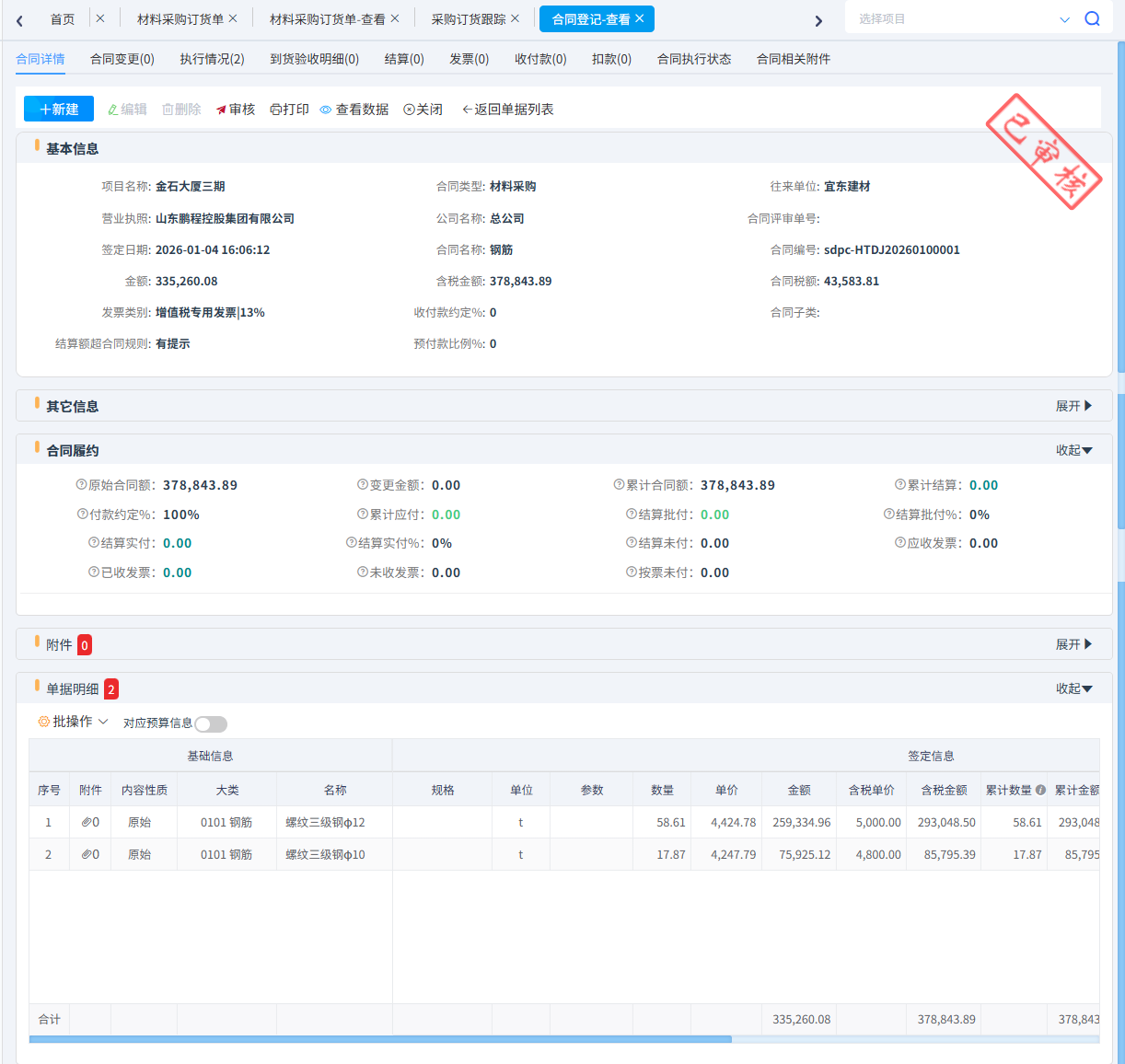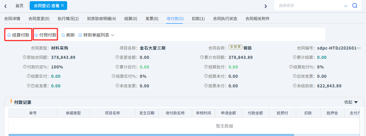 我们以生成合同为例,在合同里可以操作合同变更、材料到货验收、材料退货、材料结算、合同扣款、合同预付款、合同结算付款、合同收进发票。