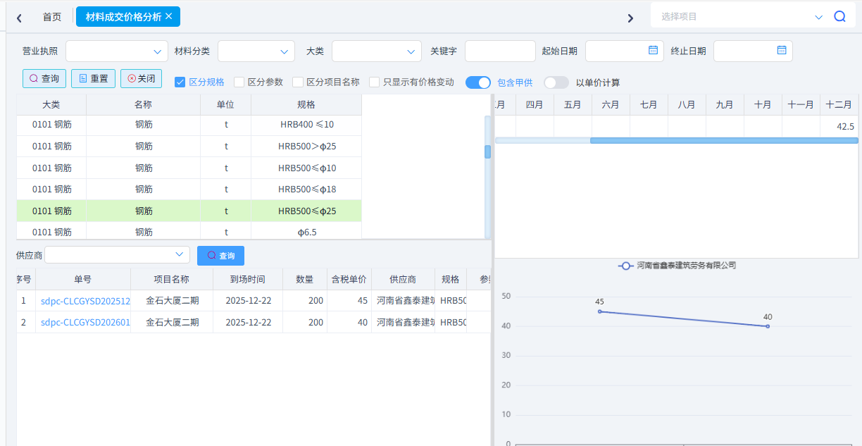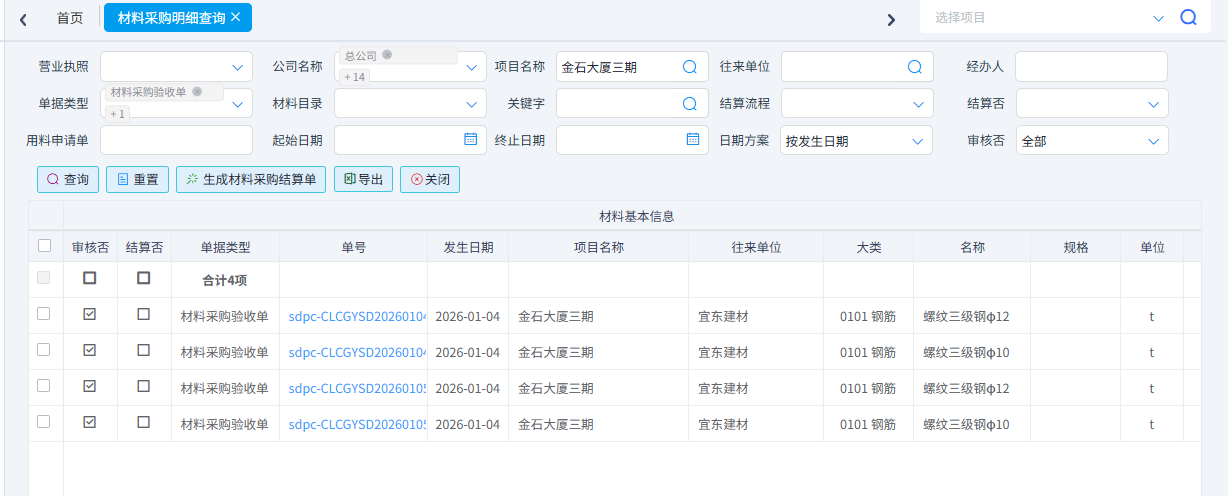 用于查询所有类型的材料单据的内容明细。该功能可满足关于材料明细的任何形式任何条件的查询。可以按照单据类型、项目名称、供应商、材料名称、时间等条件进行筛选。可以导出Excel表格。