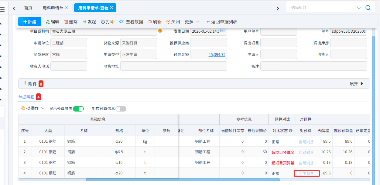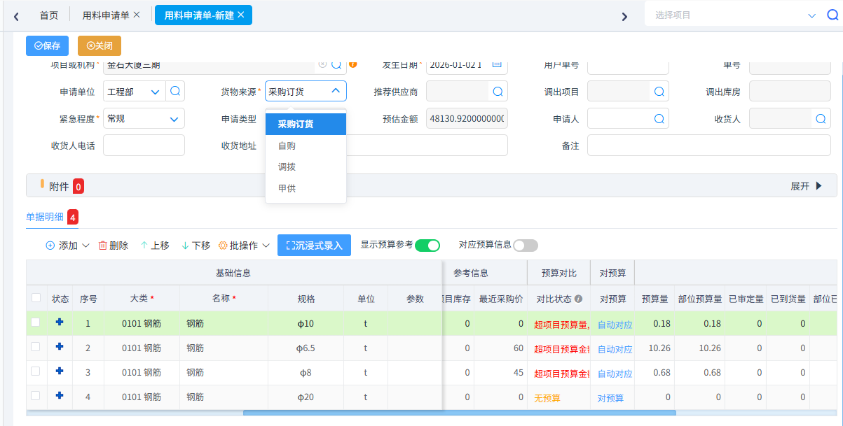 首先由项目现场施工员根据工程进度填写用料申请。申请材料明细可以从工料机预算中调取,超出预算时系统会进行预警,当购买的材料跟预算不一致是还可以手动对应预算。在用料申请单还可以选择货物来源,选择采购订货、自购、调拨、甲供。其中选择采购订货可以生成采购订货单和采购合同一般用于大宗采购或者集采。选择自购可以直接生成采购订货单,一般用于零星采购或者项目部直接采购。调拨用于申请项目调拨材料使用,后续可以生成材料调出单。甲供用于申请甲供材料,后续可以生成材料甲供验收单。