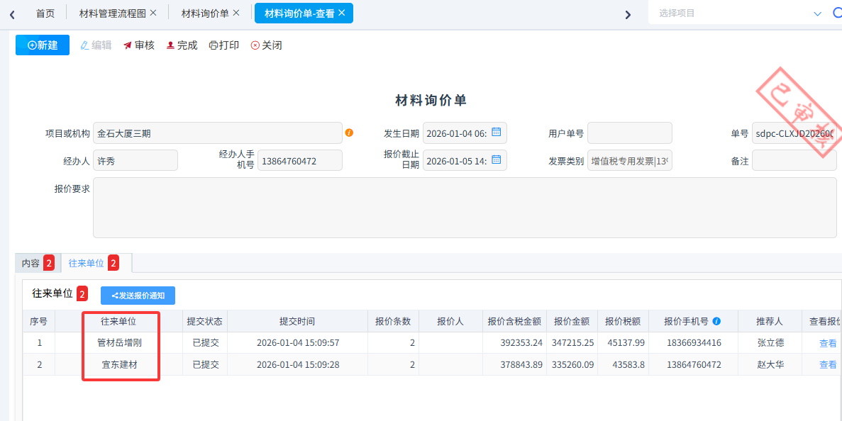 供应商提交报价后,会自动发送短信给公司询价人,询价人在系统就可以查看报价并进行比价。