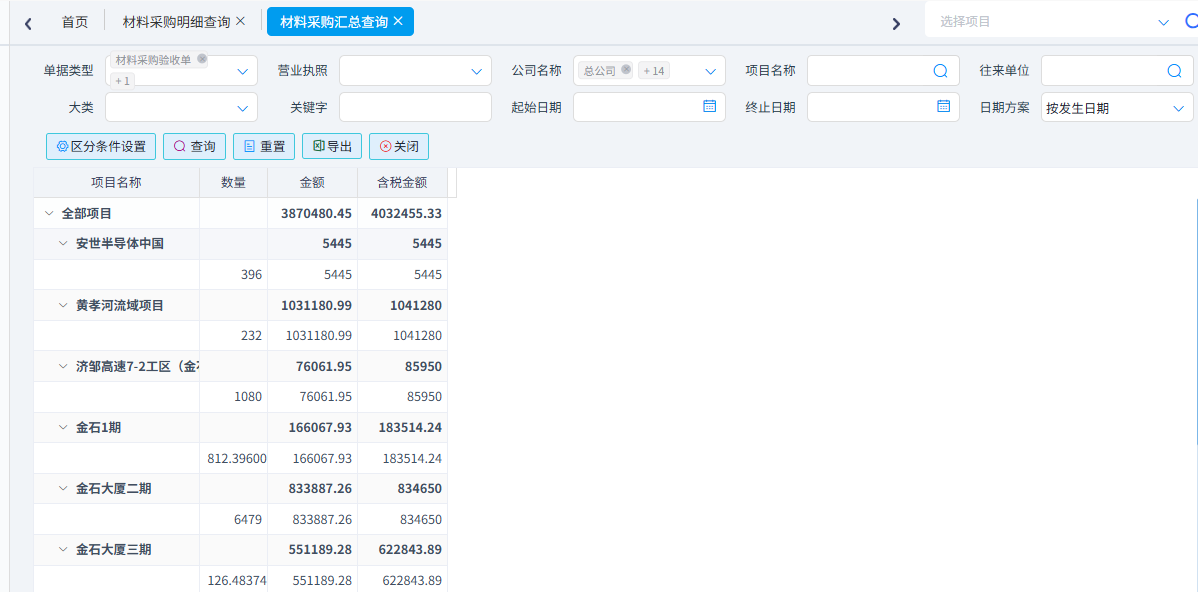 用于查询公司或者项目材料采购和退货情况,可以按照公司、项目名称、供应商、材料名称、发生日期等条件筛选。