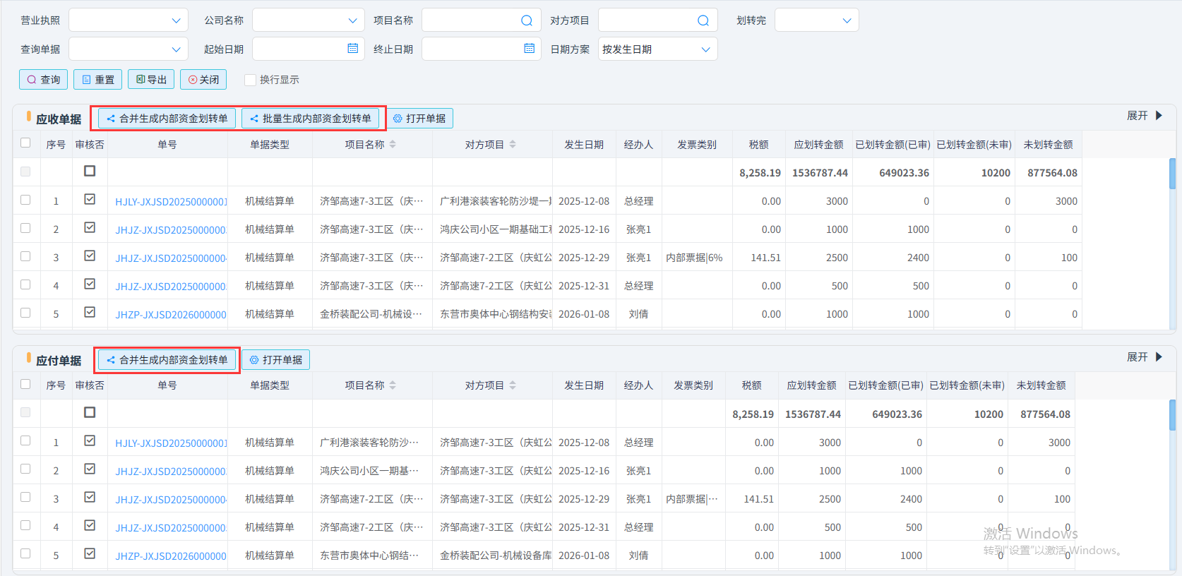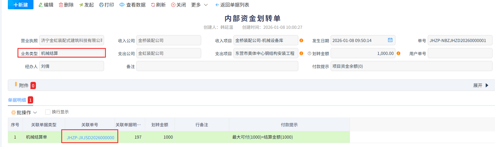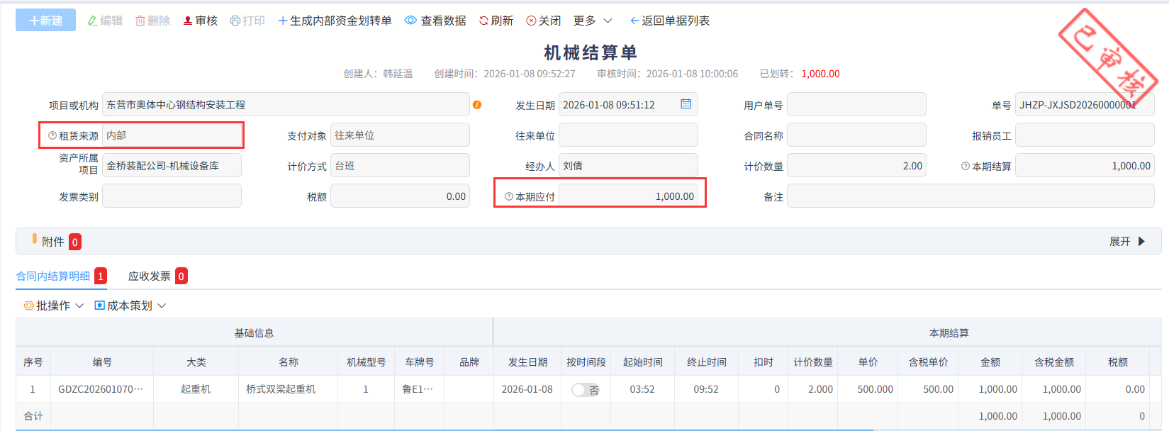 如:针对上图的机械结算单进行资金划转