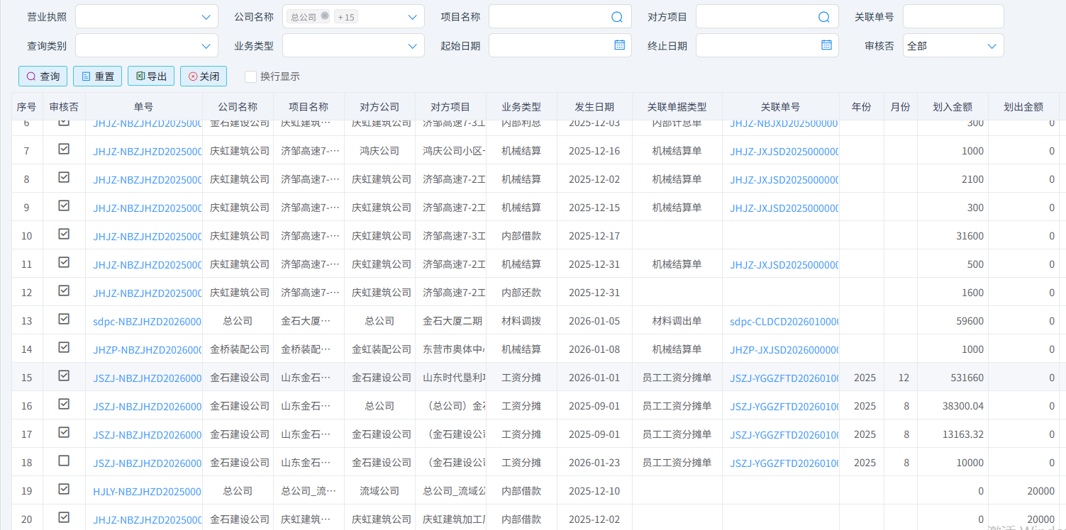 大部分内部业务是先有内部结算(如【机械结算单】、【周转材结算单】、【费用分摊】、【材料调拨】、【工资分摊】、【项目补缴税金】、【内部借款】、【内部还款】、【内部利息】)再以内部结算进行企业内部资金划转,每笔结算和划转必须是相同一个“营业执照”内不同机构或项目之间的内部往来,可规范内部资金流转,确保资金调拨有迹可循、审批合规便于财务部门统一核算、对账和资金管控。