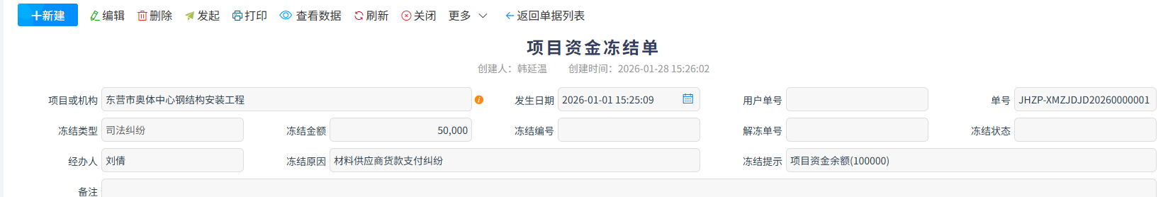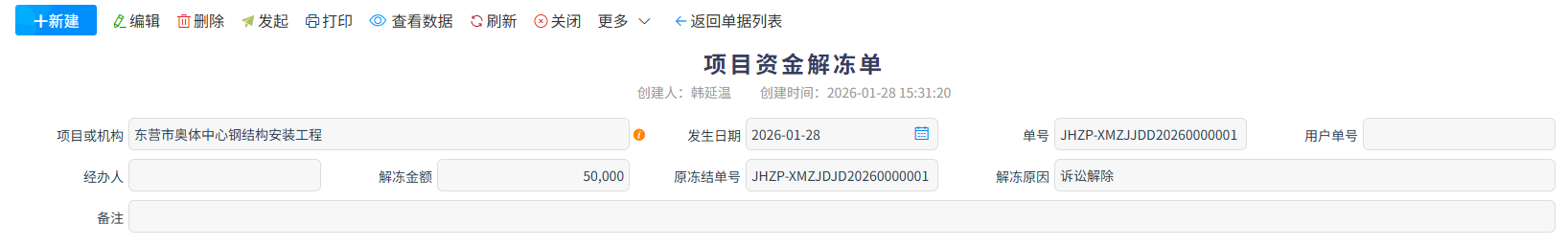 项目资金解冻单是配套【项目资金冻结单】的风控单据,用于对已冻结的项目资金发起解冻申请、完成审批流程并留存正式记录,核心是按规解除资金的支取与流转限制,让冻结资金恢复正常使用状态。
