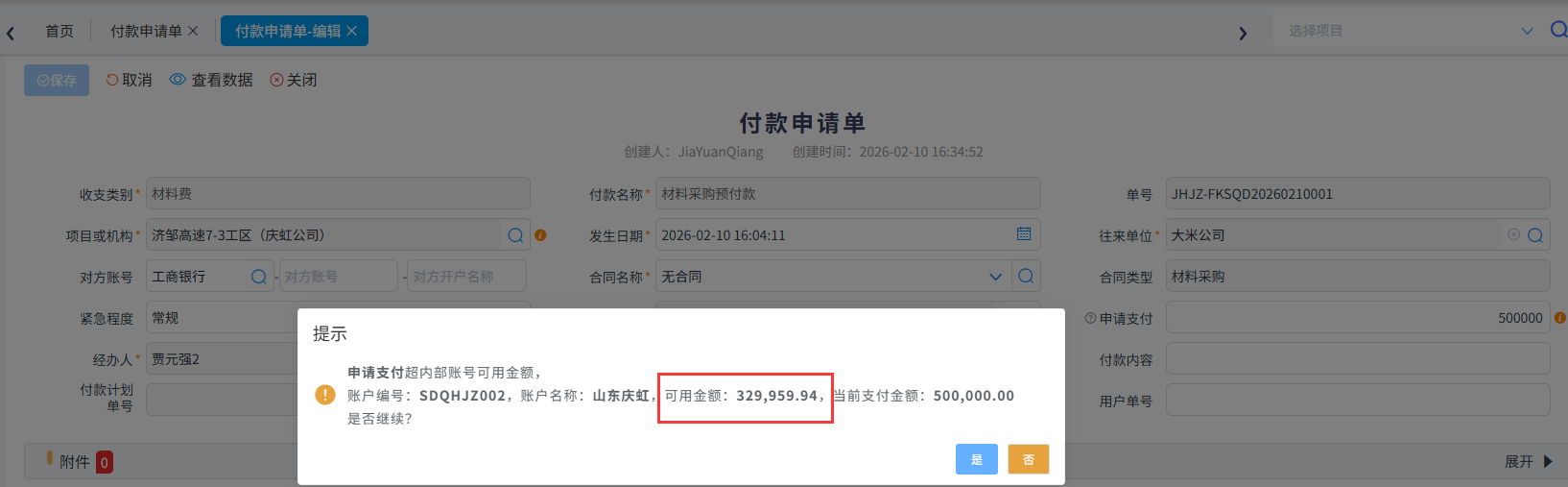 【付款申请单】超项目资金余额、内部账户金额预警提示,避免超项目的资金账户余额不足时,仍提交付款申请并完成支付,防止出现资金透支、违规垫付等问题,保障资金安全。
