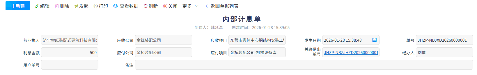 内部计息单是企业内部资金管理的核心核算单据,核心用于对公司内部账户、部门或项目间的资金拆借、占用、调拨等往来场景,按照约定利率精准核算资金占用利息,清晰记录计息基数、利率、计息周期及应付 / 应收利息金额。