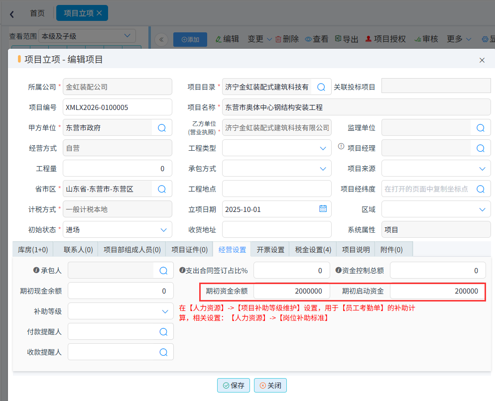 (1)项目内部资金期初设置